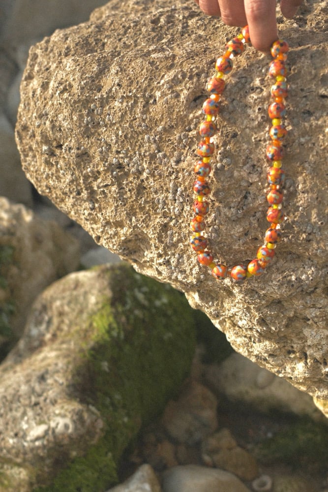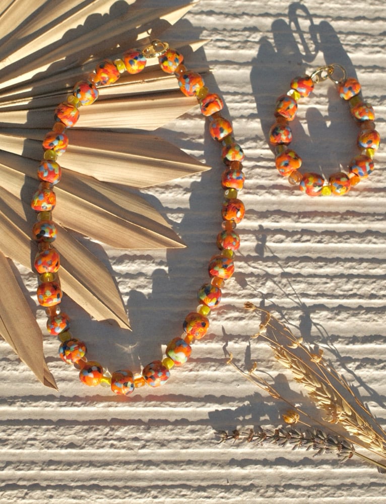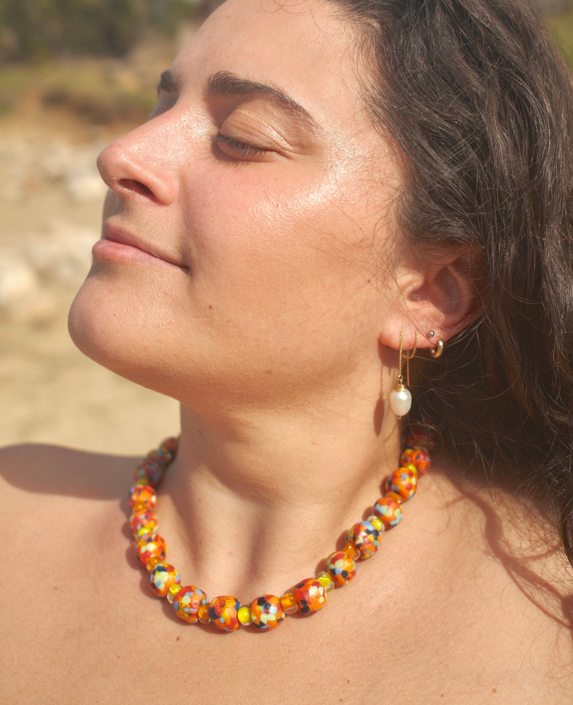 Bold and radiant, the Citrus Glow necklace features sherbet orange, and richly textured African beads. A warm, joyful statement piece that brings sunshine and soul to any look