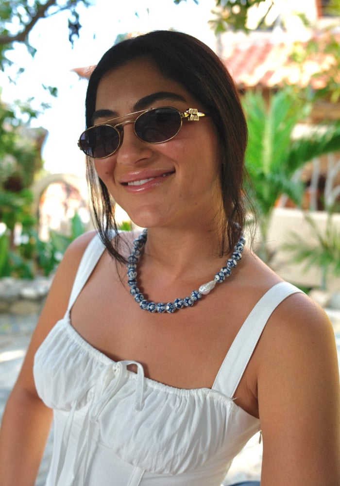Handcrafted royal blue and white porcelain beads paired with an organic baroque pearl